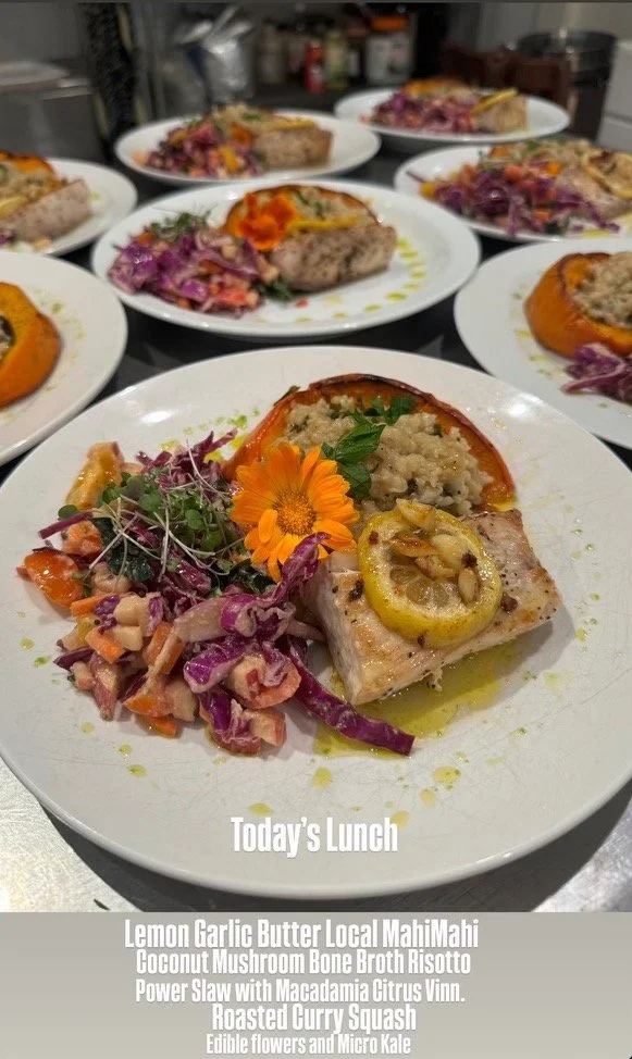 A private chef will cook us high-vibe, organic , locally-sourced delights, including coconut-macadamia nut pies, local venison stew, acai bowls, adaptogenic chai and ceremonial cacao, mahi mahi, fresh fruit and bliss balls.