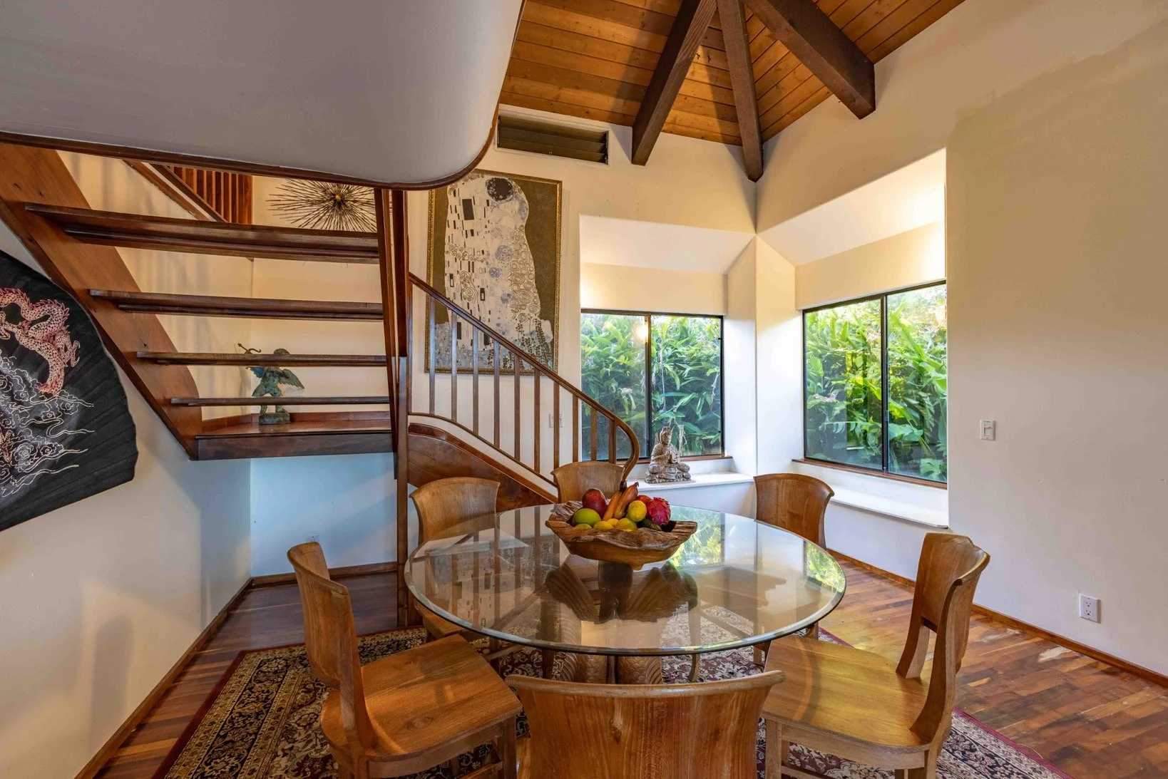 Our accommodations include the Villa, a luxurious lodging space with large lounge, warm wood, vaulted ceilings, grand marble fireplace, curving loft area, large kitchen, and exquisite Koa wood staircase.